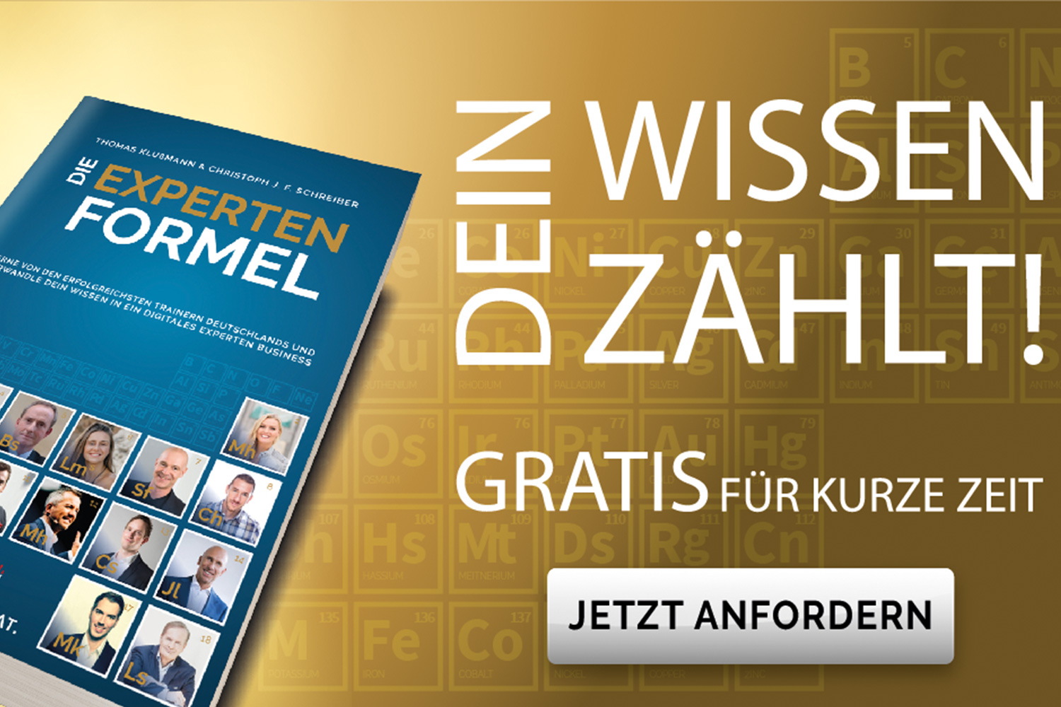 Es ist die Anleitung, mit der du dein Wissen in ein digitales Experten Business verwandeln kannst. Das Besondere: An der Experten Formel haben 16 der erfolgreichsten Trainer Deutschlands mitgeschrieben!